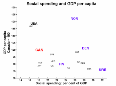 As you can see, every country but Ireland spends more on social services as a percentage of GDP. This is from 2002 OECD data. If you prefer looking at colored maps, Wikipedia has one, and the 2001 data in tabular form.