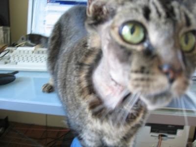 However, shortly after her original surgery, Kitty developed a benign growth on her jaw. We didn't want to go through the trauma (for her) and expense (for us) of removing it because frankly, we expected her to be dead in a month. In the following year, it grew and spread down her neck and pushed into her mouth, making it difficult for her to eat and making the surgery required to remove the tumor increasingly difficult. Finally, we decided to try surgery. I couldn't quite bear to simply wait until Kitty couldn't eat and put her to sleep.