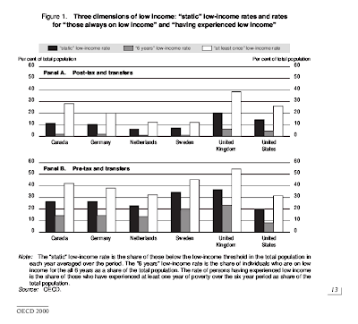 Paul Krugman's column and blog post from today refer to some good analysis of relative poverly levels in developed countries, apropos to last week's discussion. In particular, Tim Smeeding’s “Poor people in rich countries“ has some good stuff: