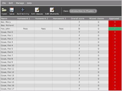 Jennifer really wants a gradebook for her XO (and I'm sure she's not the only one) and she can't connect over the school's network to use a web-based tool, so I'm going to have to take half a crack at making this usable.