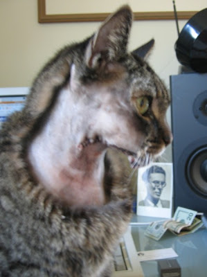 Kitty now has an two inch incision running from under her lower lip about two inches down her throat. And she's walking around the house, eating, and generally acting more confortable than she has in months. There are still about a half-dozen axes hanging over her head, but for the moment, just a remarkable display of surgical skill by Dr. Lund and resilience by Kitty.