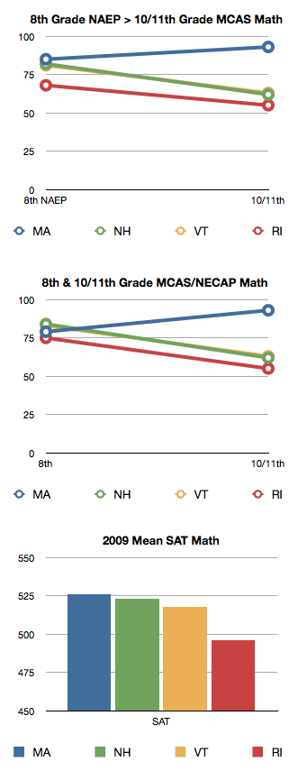 From this data you see that Vermont and New Hampshire are high performers nationwide, and that the raw proficiency rate for 8th grade NAEP is in the ballpark of 11th grade NECAP rates.