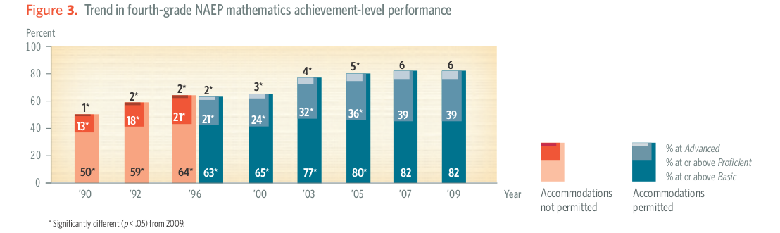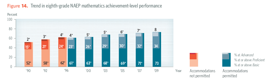 However, to make the kind of cheap extrapolation I'd have been embarrassed to even suggest a couple years ago, but now is all too common: if we had maintained the rate of growth in 4th grade mathematics established between 1990 and 1992, we'd now have 60% proficiency in 4th grade math (instead of 39%), and 72% proficiency in 8th grade math (instead of 34%)!!!!!