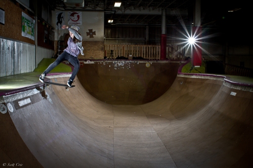 One thing about skating the late Wednesday at Skaters' Edge in the winter is that the intensity and quality of skating goes up dramatically as the weather gets worse. So it wasn't that surprising that when I arrived last night to skate the bowl there was an array of flashes set up for a photo shoot and probably the top female skater in the Northeast, Nora Vasconcellos, trying to make some tricks. I wasn't sure what the protocol was for this kind of situation but gradually mixed in my pleasure runs with her semi-business ones. Nora is part of a new generation of girl skaters which I imagine has been nurtured in the new public (and private, Nora mostly skates vert at Rye Airfield), which have a lower (social) barrier to entry than backyard ramps and secret spots.