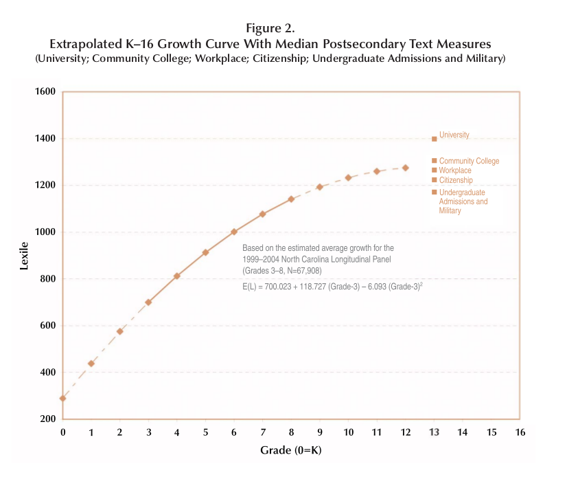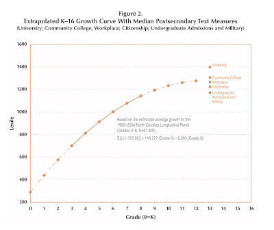 What I don't understand is that this grade 3-8 curve is supposed to be based on what was actually observed under North Carolina's old standards in 1999-2004 (which Checker Finn and friends gave a B in 2000). Nonetheless, the above curve is a bit more ambitious than the latest Common Core lexile recommendations would indicate. This just takes one back to "I have no idea what this argument is even supposed to be about."
