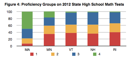 The next step is to compare, in figure 4, the scores of each of these states and Rhode Island on their respective high school math assessments. That’s the MCAS for Massachusetts, MCA-II for Minnesota, and NECAP for Vermont, New Hampshire and Rhode Island.