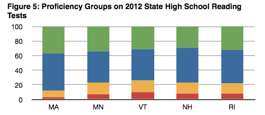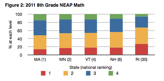 The “gold standard” for cross-state comparisons is the federal NAEP test. Unfortunately, 8th grade is the highest level at which it is regularly administered. As you can see in figure 2, Massachusetts is #1 in the nation, but Minnesota, Vermont and New Hampshire are close to each other and not far behind MA. Rhode Island lags MA by 10-15% across the achievement levels.