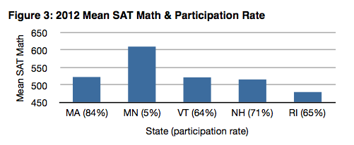 You can also see a similar pattern in SAT scores in figure 3. Minnesota is an outlier because of a low participation rate, but otherwise Massachusetts has the highest mean score (523) with Vermont (522) and New Hampshire (516) close behind, and Rhode Island trailing at 480.