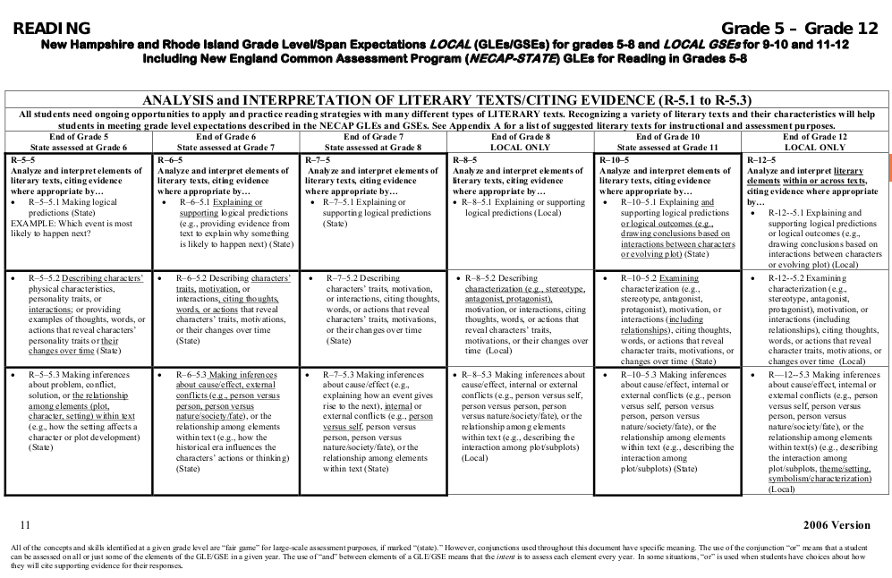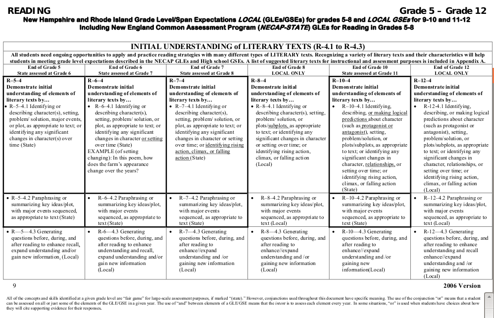 The old standard in New Hampshire said "Demonstrate initial understanding of a literary text by identifying, describing, or making logical predictions about the character or setting, problem/solution, or plots, or subplots, as appropriate to text; or identifying any significant changes in character, relationships, or setting over time; or identifying rising action, climax, or falling action."