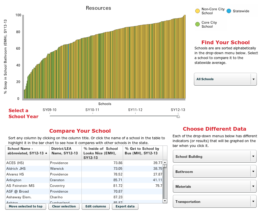 RIDE has a new data-visualization thingy for survey data, particularly on bullying. It is a little clunky and I don't think the embed code actually works (perhaps you will see it below, probably not), but nonetheless interesting. Bullying (as reported at least) seems to shift from being an urban problem in elementary school to a suburban one in high school. Our best regarded charters rank surprisingly high (that is, more bullying).