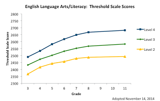 That's precisely on-point. Where did that come from? Even less noticed is the relatively flat progression after 8th grade in ELA/Literacy (notwithstanding MOAR COMPLEXITY). It would be simple enough to revise the early year standards without changing the later years much at all, keeping the overall rigor of the output of the system the same.